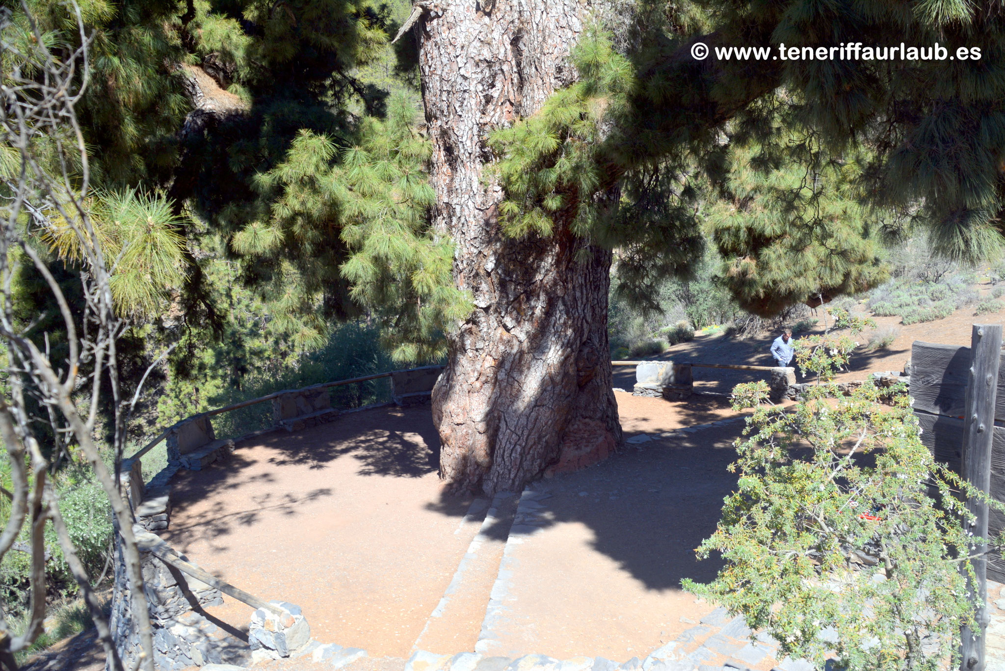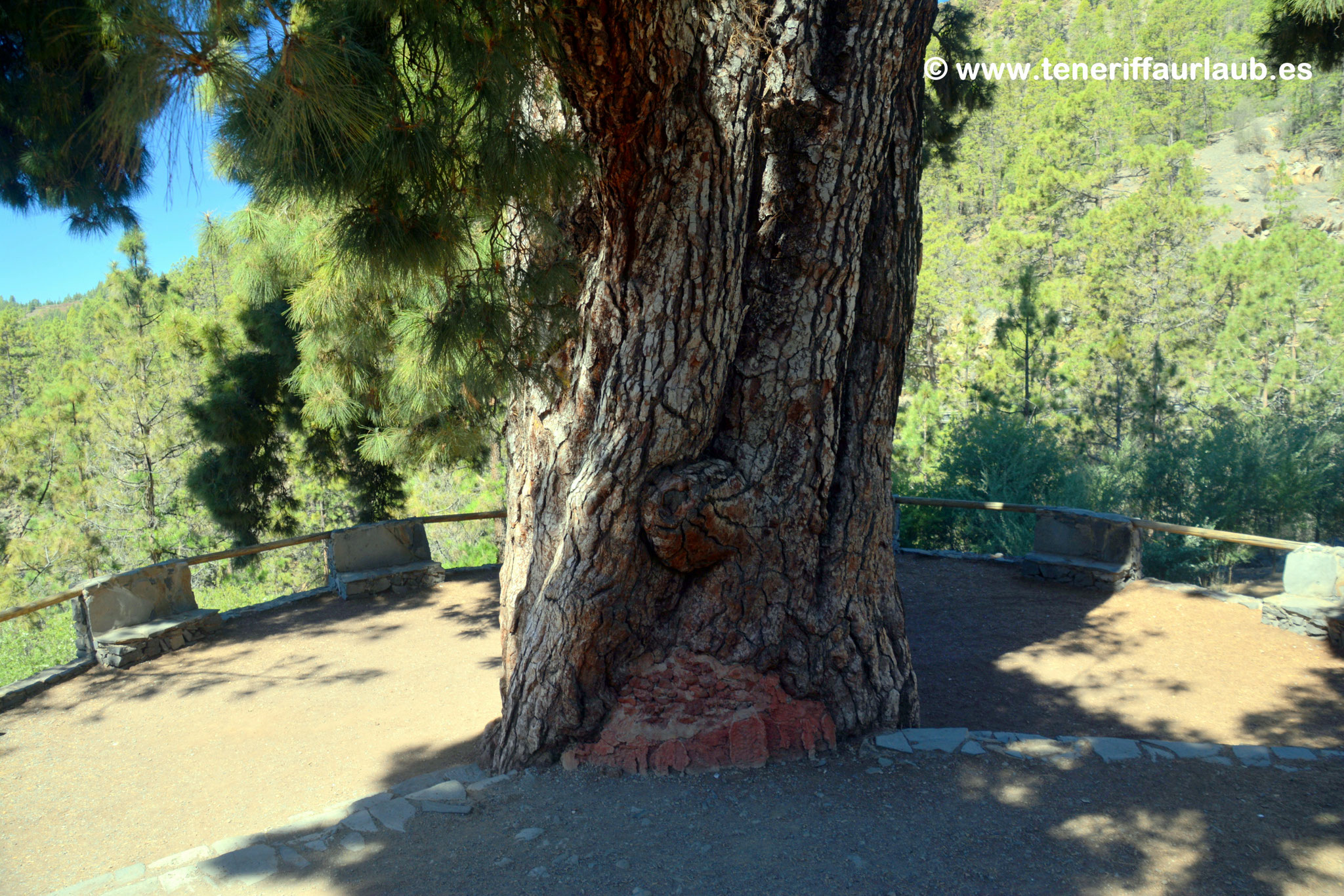 Am Ende des Pfades erreicht man eine idyllische Terrasse, die direkt unter dem Pino Gordo liegt. Hier kann man die mächtige Krone und den massiven Stamm aus nächster Nähe betrachten. Die Terrasse lädt nicht nur zum Verweilen ein, sondern bietet auch einen traumhaften Blick auf Vilaflor und die umliegenden Kiefernwälder. Die friedliche Atmosphäre dieses Ortes macht das Sitzen unter dem Baum zu einem Erlebnis für alle Sinne. Man hört nur das Rascheln der Kiefernnadeln im Wind, das Zwitschern der Vögel und den gelegentlichen Duft der harzigen Bäume.