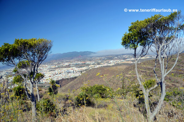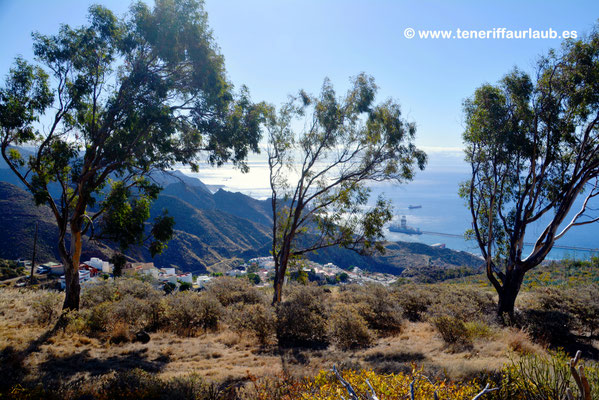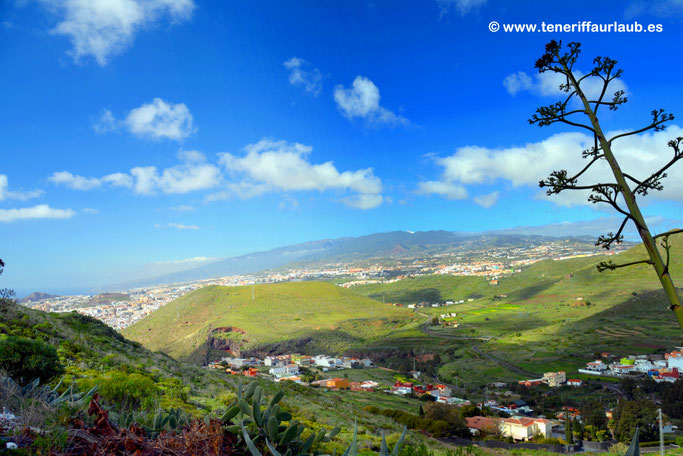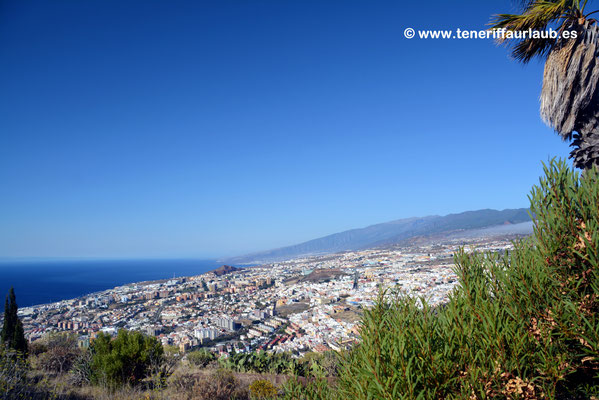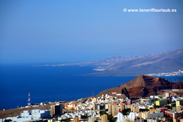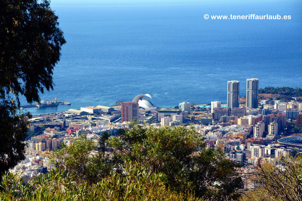 Oben angekommen, eröffnet sich ein Panorama, das zu den schönsten in der Umgebung zählt. Direkt unterhalb liegt Santa Cruz mit seinem urbanen Geflecht aus Straßen, Plätzen und modernen Gebäuden. Besonders ins Auge fällt das futuristische Auditorio de Tenerife, dessen markante Silhouette sich eindrucksvoll vor dem Meer erhebt. Der Blick schweift weiter über den geschäftigen Hafen, wo Fähren, Kreuzfahrtschiffe und Handelsschiffe ein- und auslaufen und die maritime Atmosphäre der Stadt prägen. Bei klarer Sicht lassen sich auch die Strände und Häuser von San Andrés erkennen, dem Küstenort, der mit der berühmten Playa de Las Teresitas Besucher anlockt. In der Ferne breitet sich die südöstliche Küste von Teneriffa aus, die bei Sonnenaufgang und -untergang in ein besonders malerisches Licht getaucht wird.