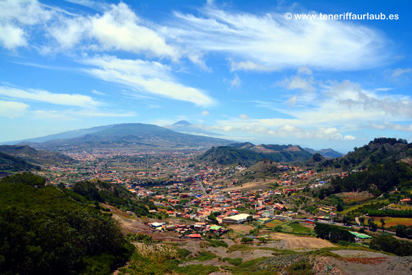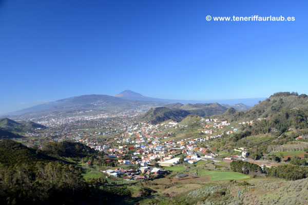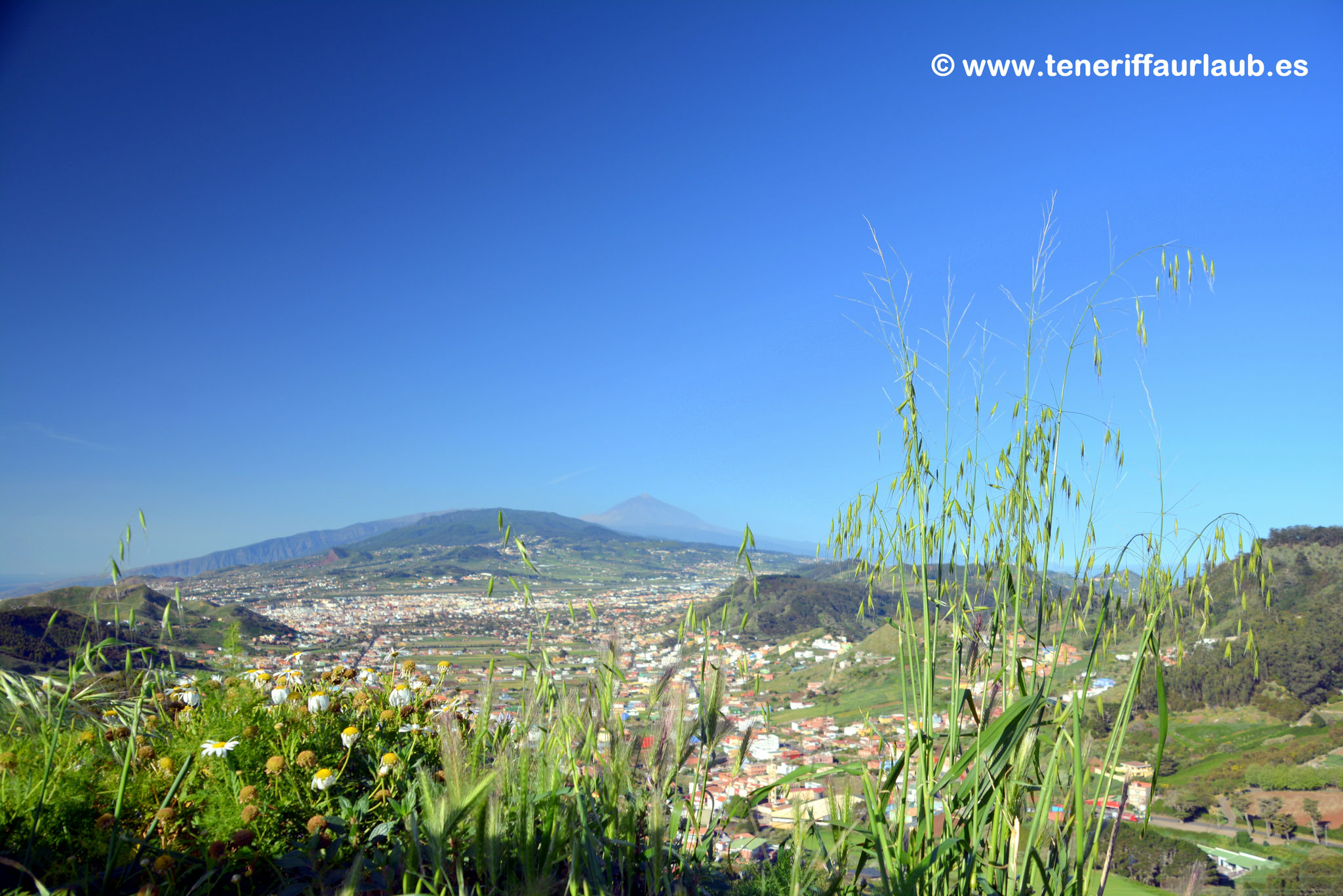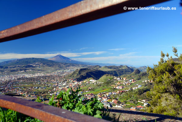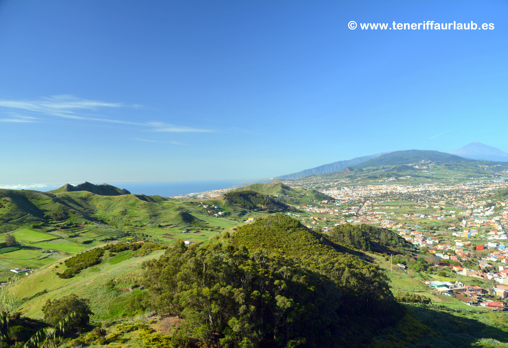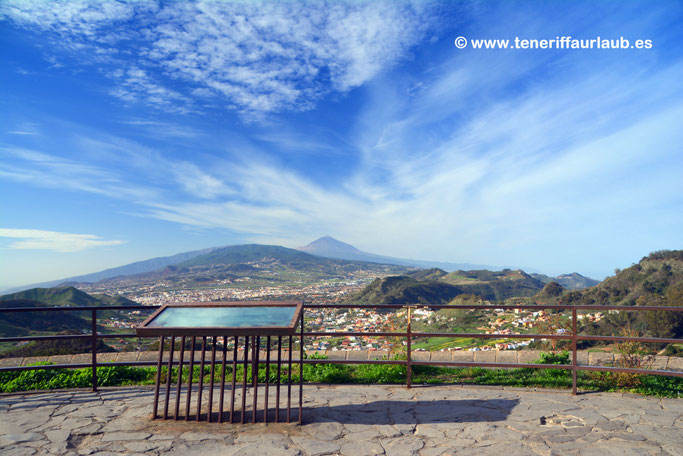 Vom Aussichtspunkt aus entfaltet sich eine eindrucksvolle Szenerie. Im Vordergrund, sanft abfallende, grüne Felder, Gärten und verstreute Gehöfte, die das Tal prägen. In der Mittlere Ebene, die Stadt San Cristóbal de La Laguna, deren Altstadt 1999 von der UNESCO zum Weltkulturerbe erklärt wurde. Ihr historischer Grundriss mit geraden Straßenachsen, den kolonialen Herrenhäusern und den farbenfrohen Fassaden ist auch aus der Ferne deutlich zu erkennen. Weiter nördlich, der Nordflughafen Aeropuerto Internacional de Los Rodeos (Tenerife Norte-Ciudad de La Laguna), der auf einem Hochplateau liegt und oft von Nebelschwaden umspielt wird. Im Hintergrund, der majestätische Pico del Teide, mit 3.715 Metern der höchste Berg Spaniens und zugleich UNESCO-Weltnaturerbe. In den Wintermonaten ist seine Kuppe oft schneebedeckt, im Sommer thront er als mächtige Silhouette über der gesamten Insel.