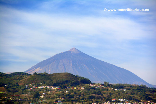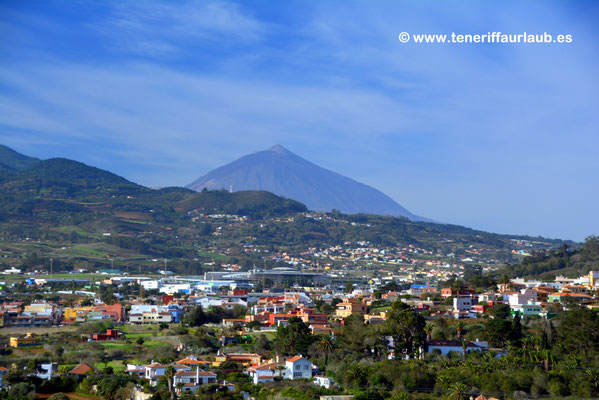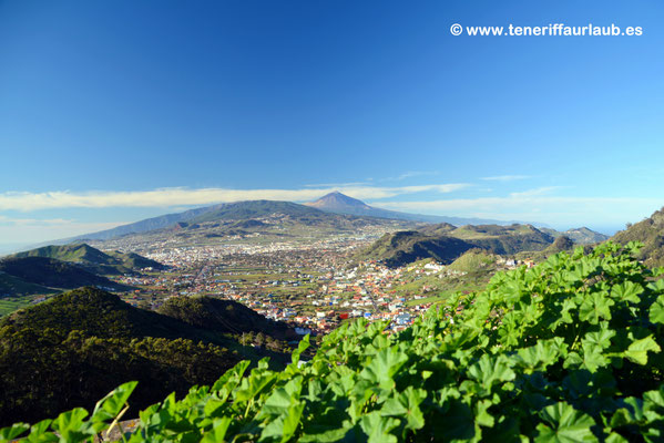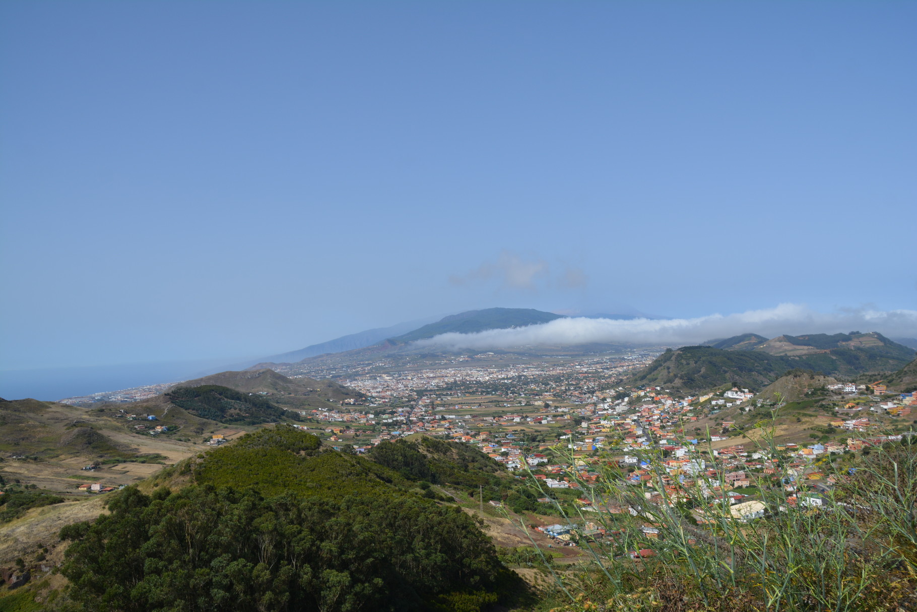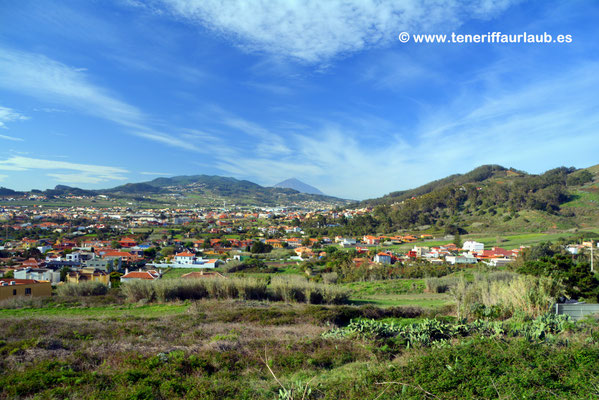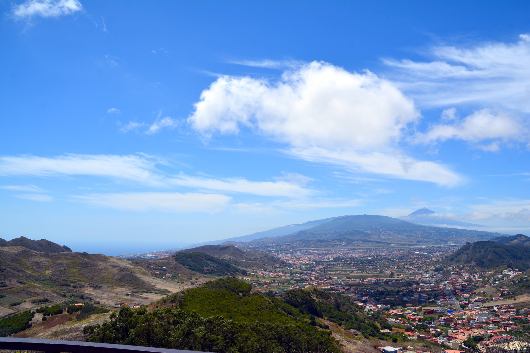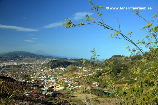 Vom Aussichtspunkt aus entfaltet sich eine eindrucksvolle Szenerie. Im Vordergrund, sanft abfallende, grüne Felder, Gärten und verstreute Gehöfte, die das Tal prägen. In der Mittlere Ebene, die Stadt San Cristóbal de La Laguna, deren Altstadt 1999 von der UNESCO zum Weltkulturerbe erklärt wurde. Ihr historischer Grundriss mit geraden Straßenachsen, den kolonialen Herrenhäusern und den farbenfrohen Fassaden ist auch aus der Ferne deutlich zu erkennen. Weiter nördlich, der Nordflughafen Aeropuerto Internacional de Los Rodeos (Tenerife Norte-Ciudad de La Laguna), der auf einem Hochplateau liegt und oft von Nebelschwaden umspielt wird. Im Hintergrund, der majestätische Pico del Teide, mit 3.715 Metern der höchste Berg Spaniens und zugleich UNESCO-Weltnaturerbe. In den Wintermonaten ist seine Kuppe oft schneebedeckt, im Sommer thront er als mächtige Silhouette über der gesamten Insel.