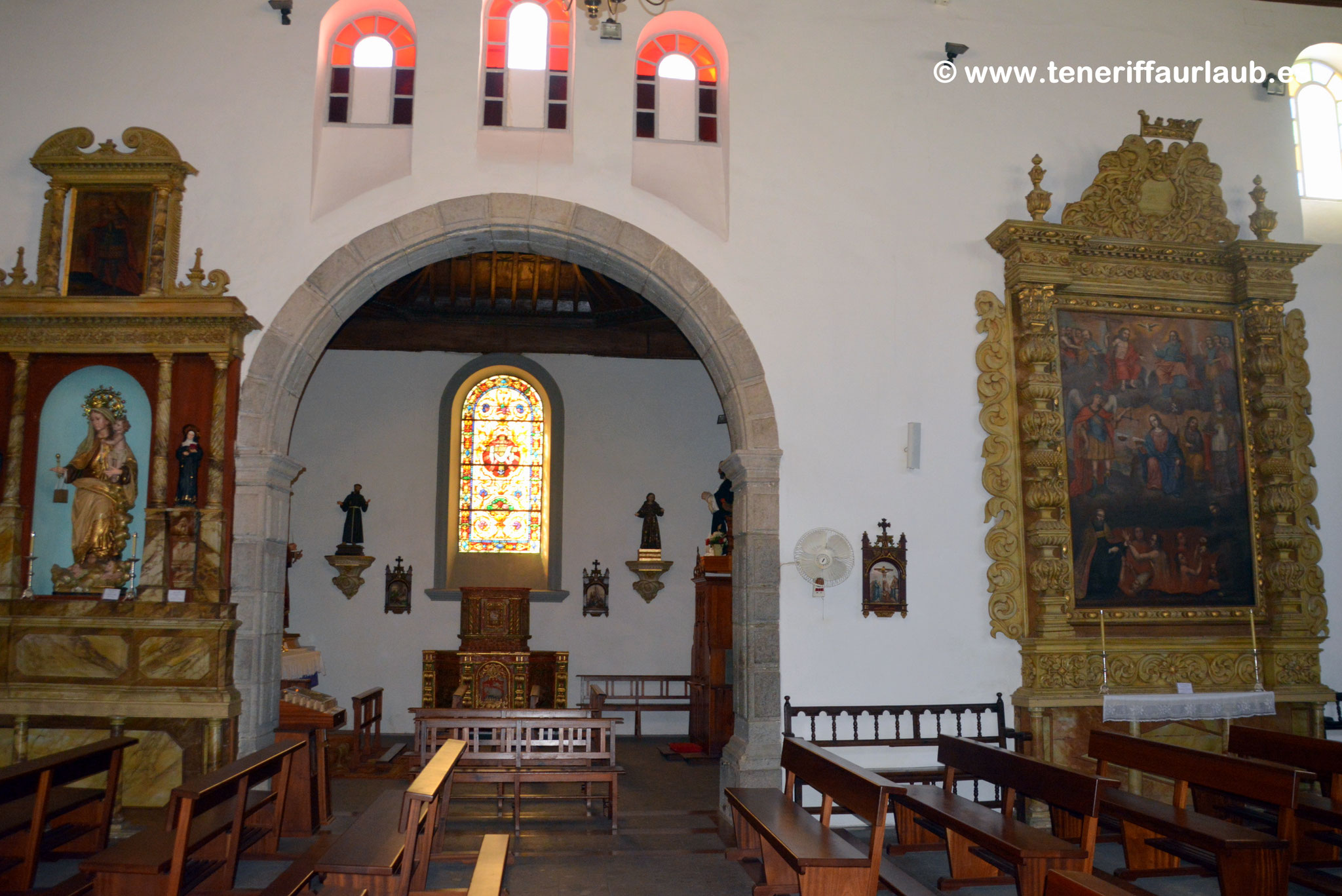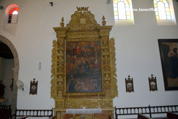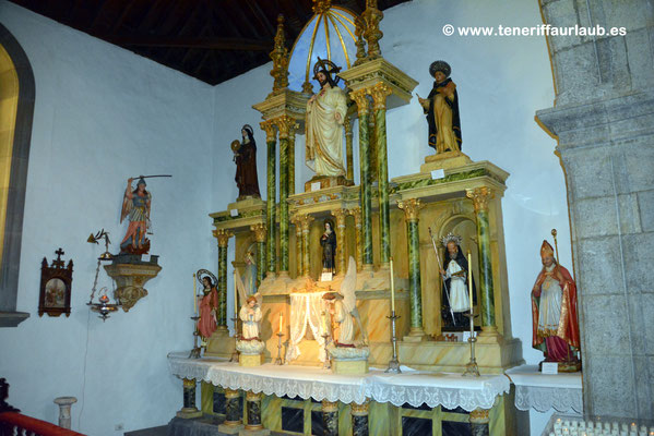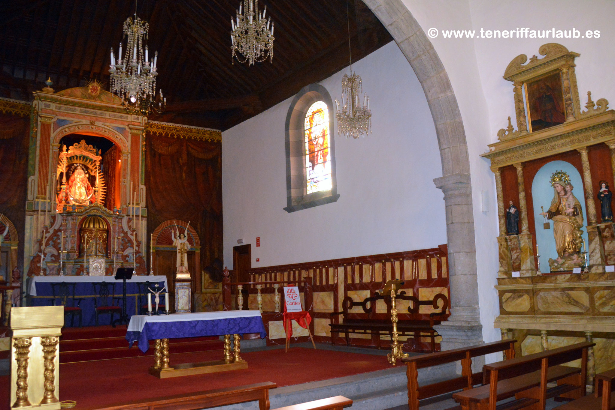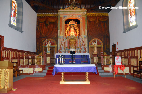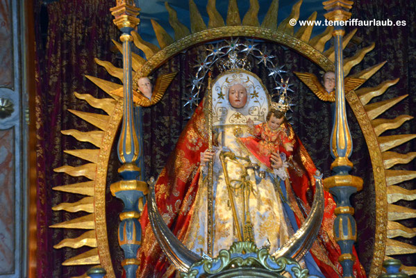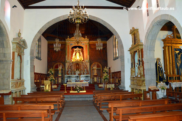 Im Zentrum steht das barocke Hauptretabel des 18. Jahrhunderts, das 2012 mit Unterstützung der Gemeinde sorgfältig restauriert wurde, seither leuchtet die Vergoldung wieder warm über dem Altarraum. Hinter dem Retabel verbirgt sich das vielleicht außergewöhnlichste Ausstattungsstück der ganzen Insel, ein großer, hölzerner Hebe-Mechanismus („torno“), der an die Pressen der alten Weinkeller erinnert und die Patronin jedes Jahr feierlich in ihr Camarín hebt, ein Unikat auf den Kanaren. Zu den bedeutenden Bildwerken zählt der barocke „Santísimo Cristo de la Misericordia“, der dem andalusischen Bildhauer Francisco de Ocampo zugeschrieben wird, ebenso der „Señor de la Humildad y la Paciencia“ und die Statue der Virgen de la Luz selbst, deren Verehrung die Identität des Ortes prägt. Ergänzt wird dies von qualitätvollen Leinwänden (u. a. eine Apoteose des hl. Dominikus und ein klassisches Ánimas-Bild), die die barocke Frömmigkeit der Gemeinde spiegeln. Auch der Kirchenschatz ist bemerkenswert. Er umfasst eine Renaissance-Prozessionskreuz aus der Zeit um 1580, eine prachtvolle, vermutlich in Mexiko gefertigte Kaiserkrone für die Patronin (um 1650), sowie weitere Silbergeräte und Stiftungen, die über die Verbindungen der Silenser nach Amerika in der Frühen Neuzeit in die Pfarrkirche gelangten. Bei großen Feiern trägt die Virgen diese historische Krone.