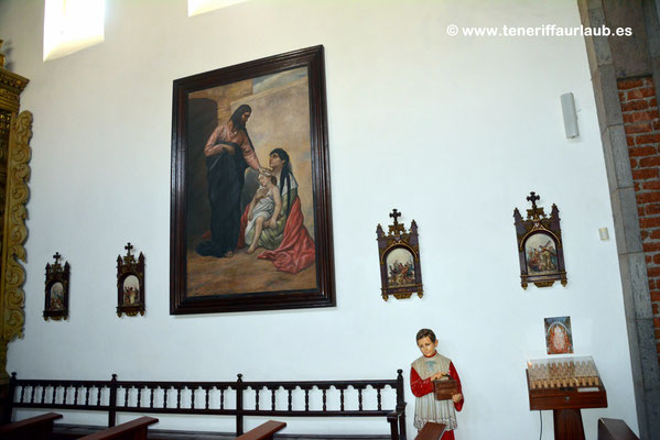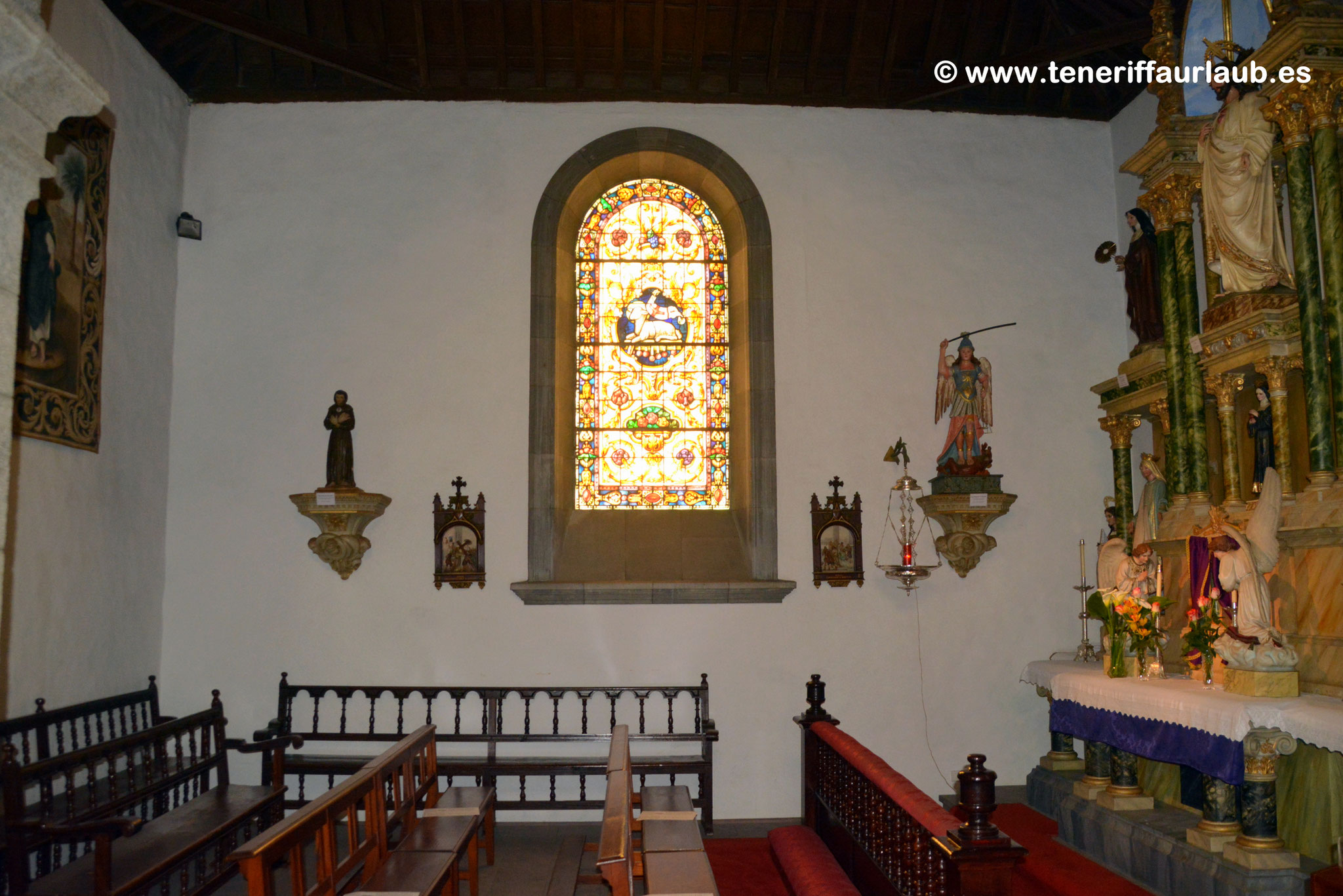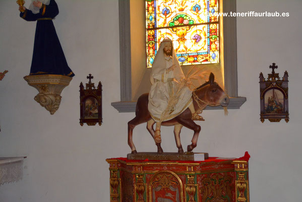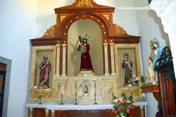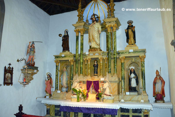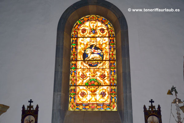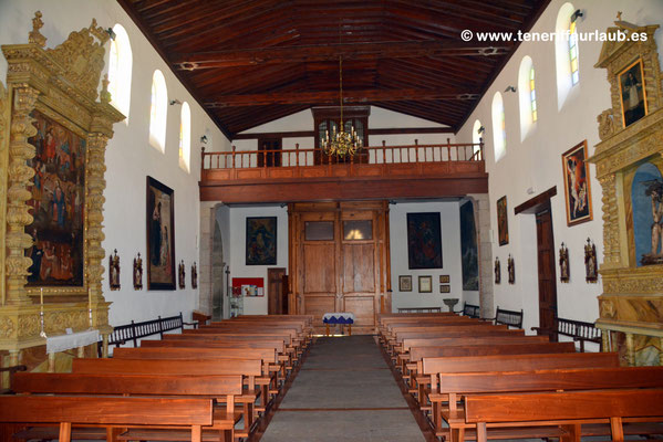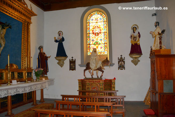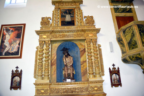 Im Zentrum steht das barocke Hauptretabel des 18. Jahrhunderts, das 2012 mit Unterstützung der Gemeinde sorgfältig restauriert wurde, seither leuchtet die Vergoldung wieder warm über dem Altarraum. Hinter dem Retabel verbirgt sich das vielleicht außergewöhnlichste Ausstattungsstück der ganzen Insel, ein großer, hölzerner Hebe-Mechanismus („torno“), der an die Pressen der alten Weinkeller erinnert und die Patronin jedes Jahr feierlich in ihr Camarín hebt, ein Unikat auf den Kanaren. Zu den bedeutenden Bildwerken zählt der barocke „Santísimo Cristo de la Misericordia“, der dem andalusischen Bildhauer Francisco de Ocampo zugeschrieben wird, ebenso der „Señor de la Humildad y la Paciencia“ und die Statue der Virgen de la Luz selbst, deren Verehrung die Identität des Ortes prägt. Ergänzt wird dies von qualitätvollen Leinwänden (u. a. eine Apoteose des hl. Dominikus und ein klassisches Ánimas-Bild), die die barocke Frömmigkeit der Gemeinde spiegeln. Auch der Kirchenschatz ist bemerkenswert. Er umfasst eine Renaissance-Prozessionskreuz aus der Zeit um 1580, eine prachtvolle, vermutlich in Mexiko gefertigte Kaiserkrone für die Patronin (um 1650), sowie weitere Silbergeräte und Stiftungen, die über die Verbindungen der Silenser nach Amerika in der Frühen Neuzeit in die Pfarrkirche gelangten. Bei großen Feiern trägt die Virgen diese historische Krone.